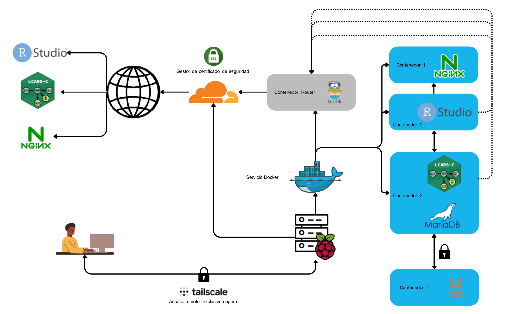 El sistema electrónico de captura de datos clínicos consta de una plataforma digital alojada en un dominio web accesible a través de autenticación, el cual está enlazado a un contenedor digital de base de datos SQL Mariadb. Los datos almacenados en esta se encuentran encriptados con el objetivo de mantener la seguridad y privacidad de los mismos, los cuales únicamente pueden ser accedidos por el investigador y con la posibilidad de ser auditadas. Dicha base de datos se encuentra enlazada con un contenedor de RStudio server para la realización del análisis estadístico, manteniendo la encriptación de los datos y disminuyendo el riesgo de filtración de datos.